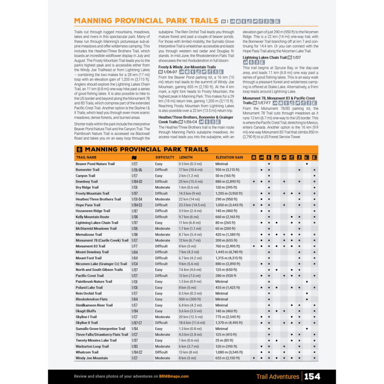 | Trails | Trail charts for top hiking areas like Manning, Mount Robson, Wells Gray & Okanagan Park |