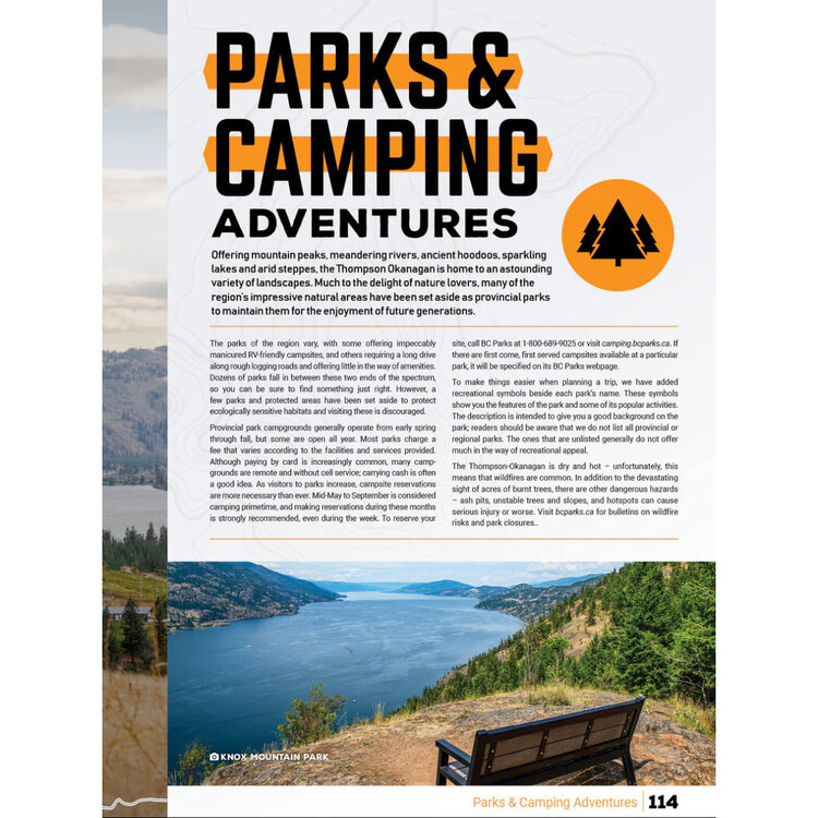 | Parks & Campsites | 100+ Provincial & Regional Parks, with location highlights, activity icons, and travel details from Cathedral to Mount Robson. |