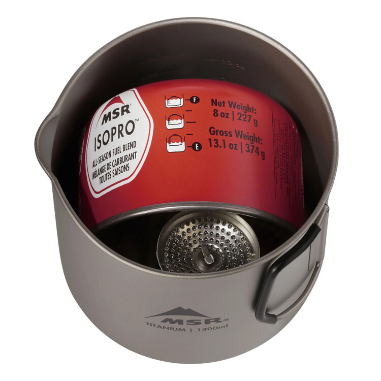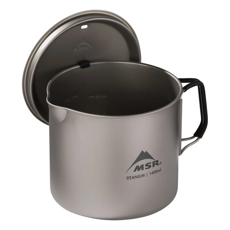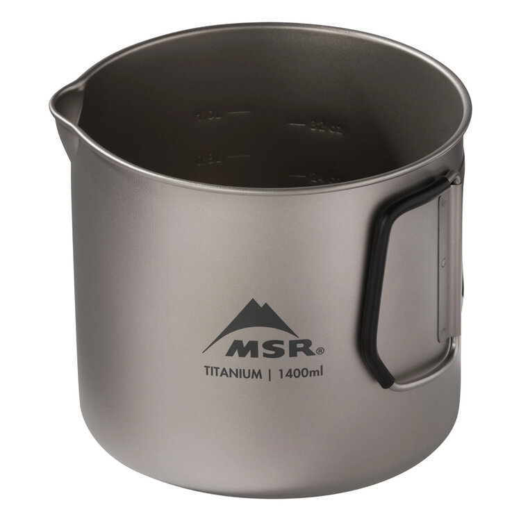The Titan Kettle 1400mL is the perfect cook pot for gram-counting backcountry duos thanks to its ultralight packability and performance titanium. Interior graduation lines allow for fast and easy volume measuring for dehydrated meals and drinks. An improved spout makes precision pouring easier for dehydrated meal bags. Silicone-coated folding handles are comfortable to hold, and the snug-fit lid features a silicone hanger to keep it safely out of the dirt. Plus, the entire Titan cookware collection nests together, often with a stove and/or fuel canister so you can easily build your ideal cook setup.