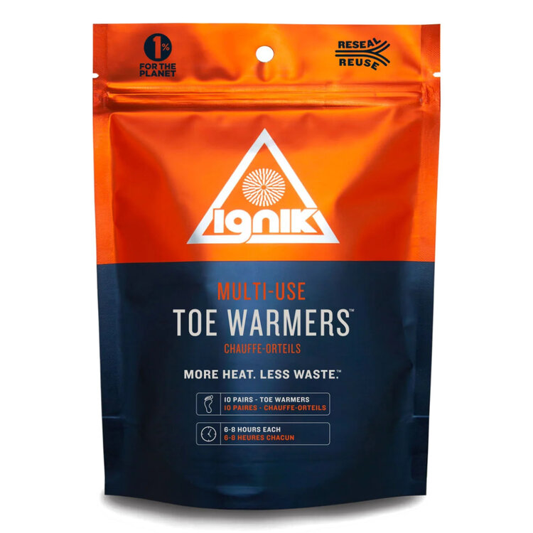 Ignik Toe Warmers are Arctic Grade, designed to solve the biggest problems you face with cheaper air-activated warmers; providing reliable, consistent, and long-lasting heat when you need it and with less waste. They start with the highest quality, naturally active ingredients. The contents are safe, all-natural, and biodegradable. Their AirBarrier™ pouch keeps more air out for more reliable heat - up to 8 hours each, more heat than the leading brands. The resealable top gives you control to use the warmers when you need them. Store unused open warmers for up to 72 hours later. The outer pouch is reusable and 100% recyclable. The end result is a higher performance toe-warmer, which is more efficient and less wasteful.