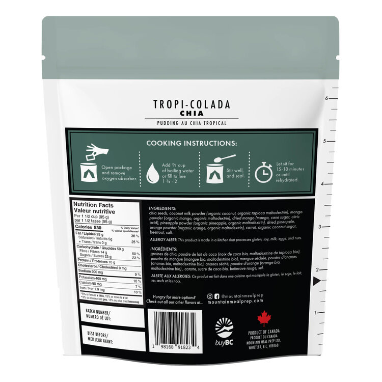 Escape to the tropics with Tropi-Colada Chia! This delicious mountain meal is a chia seed pudding with a tropical punch, made with coconut milk, mango, pineapple, and orange. It’s packed full of flavour, ready to fuel your next adventure.