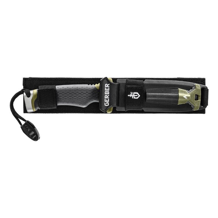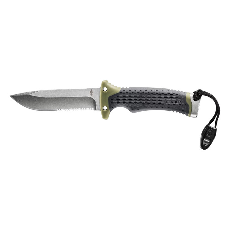 Loaded with innovations, this knife has everything. The Gerber Ultimate Survival Knife features a half serrated, drop point blade, a textured rubber grip, a steel hammer pommel, and an emergency whistle. The durable sheath has a sharpener and a firestarter.