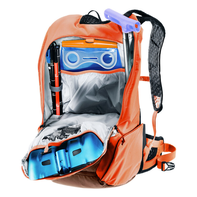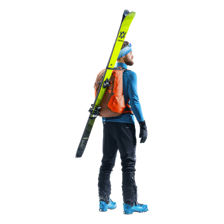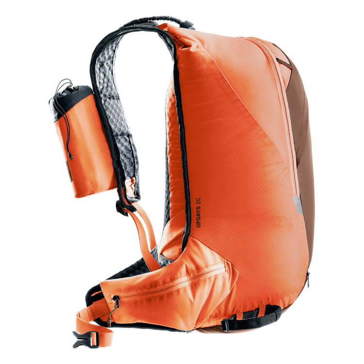 Just 710 g. Ultra-lightweight with deuter Lite comfort for speed ski touring: good ventilation, ergonomic hip fins and shoulder straps with a detachable sternum strap and foam back pad (removable) combine to create a snug fit with zero load wobble. An adjustable quick-fix diagonal ski attachment system with a sliding loop that fits round the ski ends and a bungee cord that wraps round the tips and secures to a hook on the shoulder strap gives the Updays quick and easy handling. An easy-access bottom compartment also makes it quick to get at skins, ski crampons or climbing crampons, without having to take the pack off. A climate neutral product.