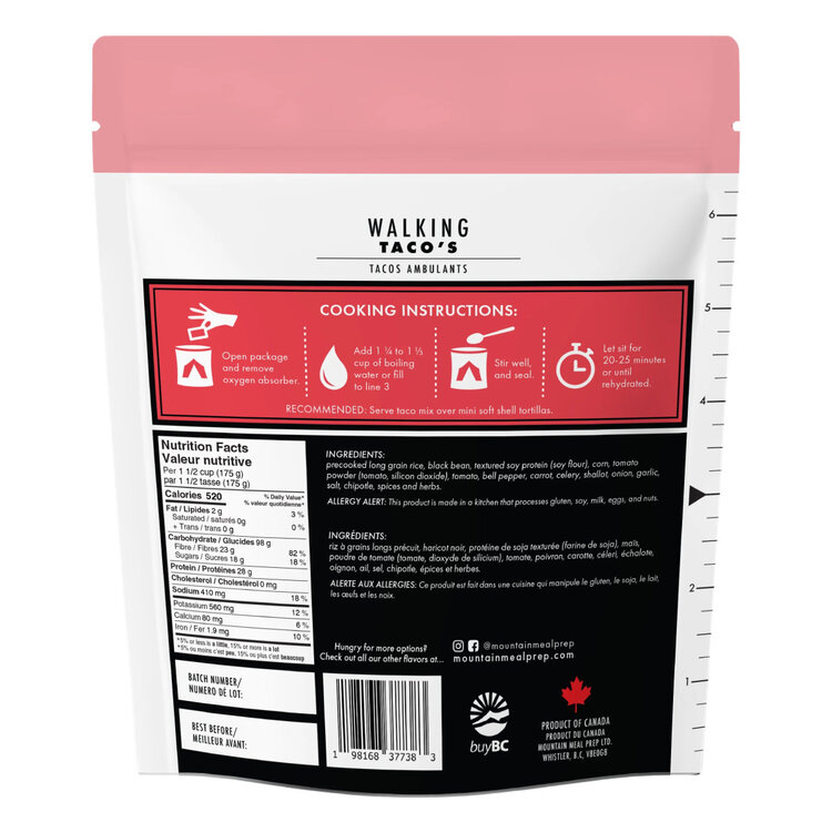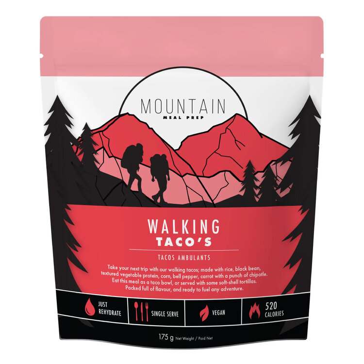 Craving tacos on the trail? Walking Tacos offers a delicious twist on walking tacos! Made with rice, black beans, corn, bell pepper, carrot, and a bold punch of chipotle, you can enjoy this vegan backpacking meal straight out of the pouch or serve it over soft tortillas. Packed full of flavour and ready to fuel any adventure.