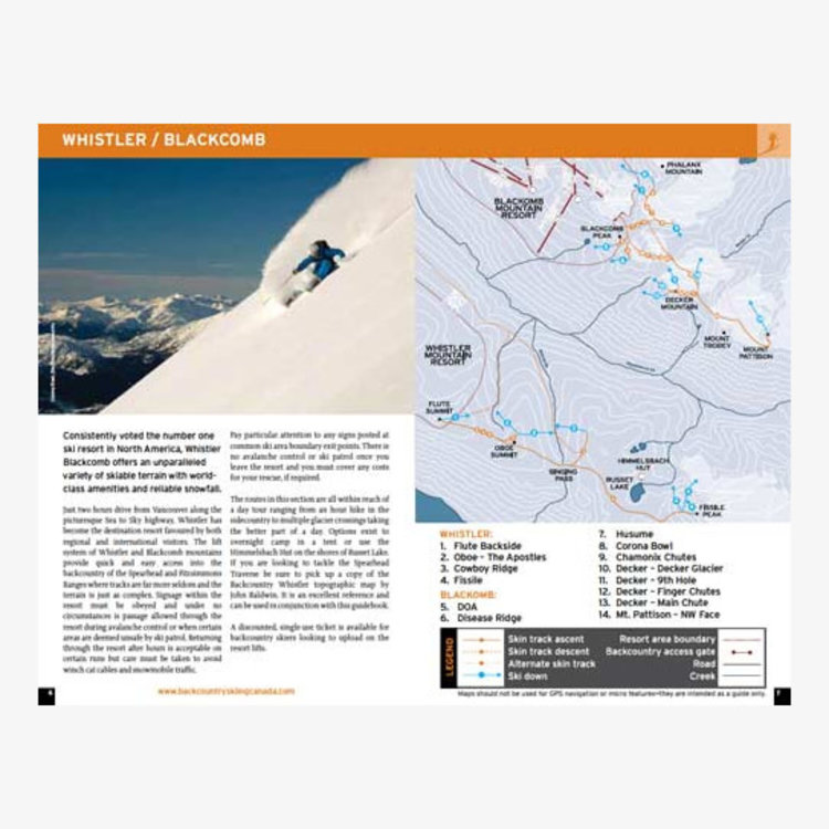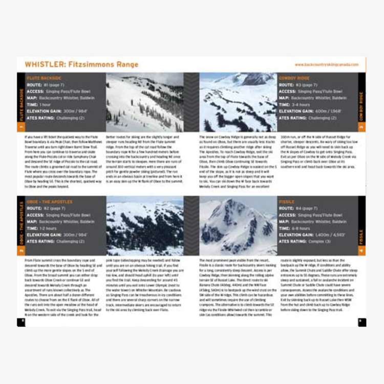 The Backcountry Skiing Canada Whistler & Area Ski Touring Guide is your resource for information on ski touring powder in the Coast Mountains of British Columbia. It is 36 pages and covers Whistler/Blackcomb Mountain Resort, Elfin Lakes and Duffy Lakes.