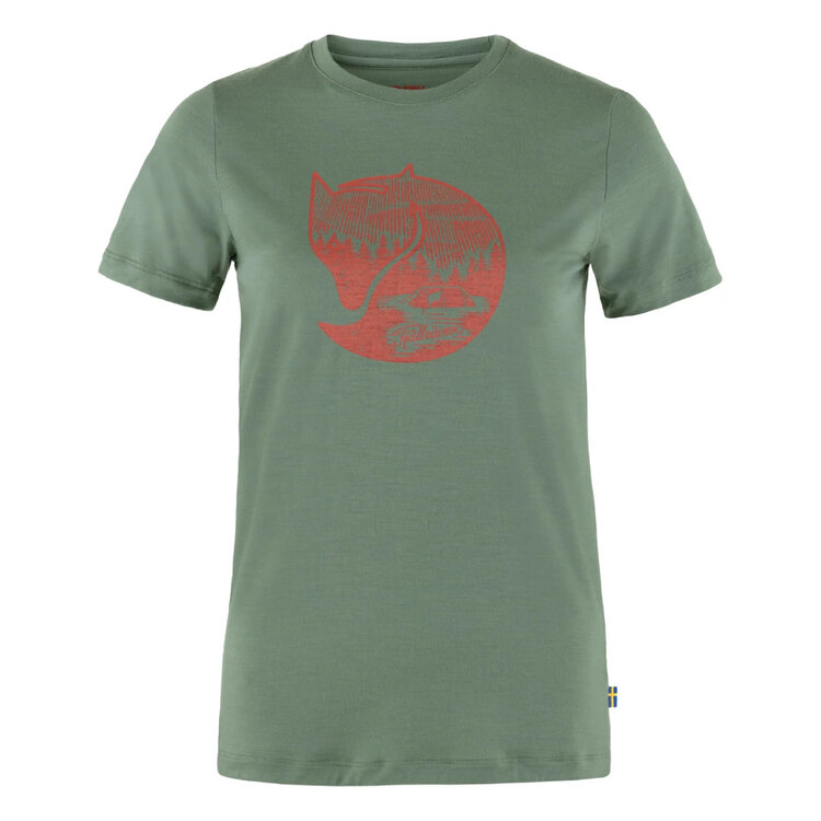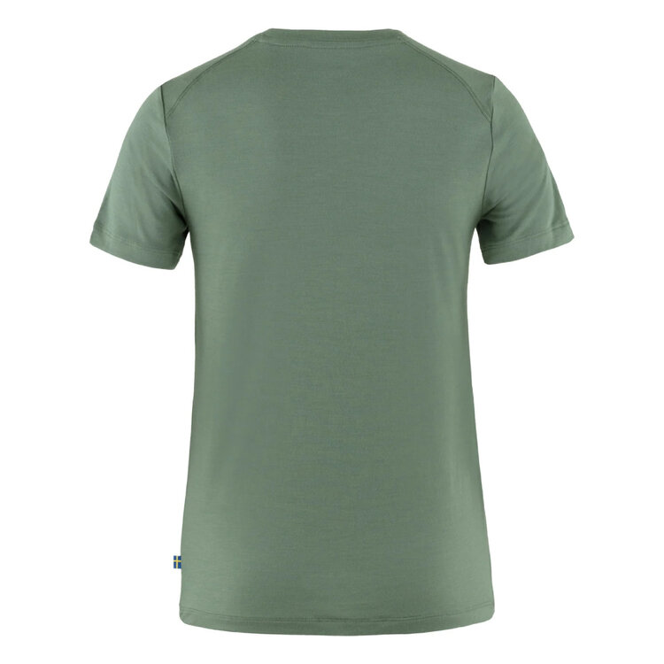 Lightweight short-sleeved t-shirt in a soft jersey knit made from a merino wool polyester blend. Combines the temperature-regulating properties of natural fibres with the durability and moisture-wicking properties of synthetic ones. A perfect first layer in both warm and cold climates, and extra useful on multiday trips as wool naturally resists bad odours. Printed with a Fjällräven logo on the chest.