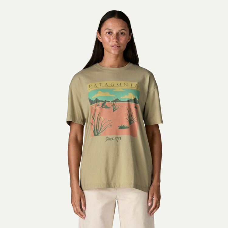 In Patagonia's archives, they found a desert scene T-shirt graphic from the 1980s. They gave it some love and screen-printed it on their Women's Desert Glow Oversized T-Shirt. You'll find this oversized tee roomy, with a relaxed-fit and longer sleeves, straight side seams and more width through the chest and torso. Made in a Fair Trade Certified™ factory.