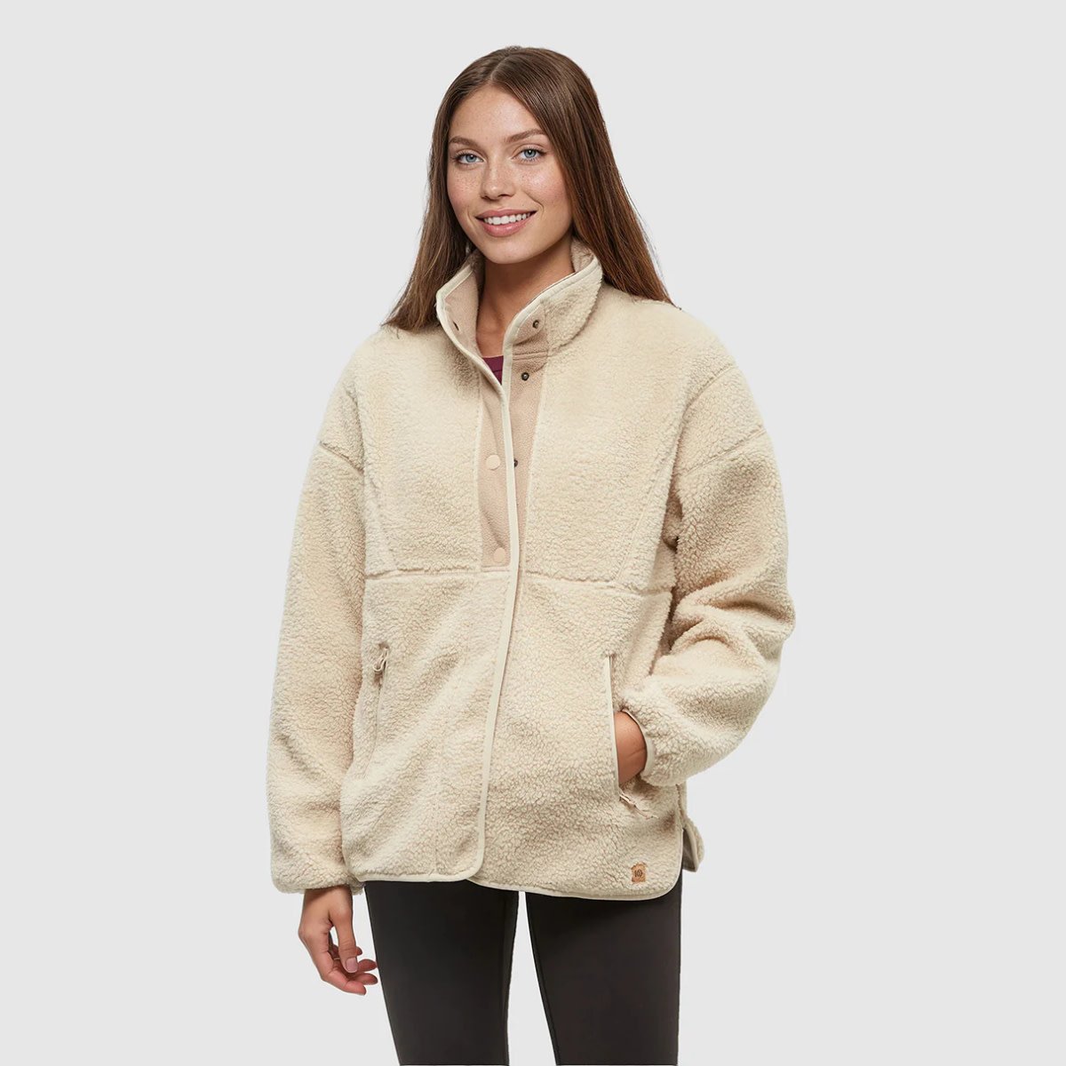 This everyday fleece works as hard as you chill — with a mock neck, zippered pockets, a full snap front, and sherpa-bonded to microfleece fabric that keeps warmth in and the cold out.
