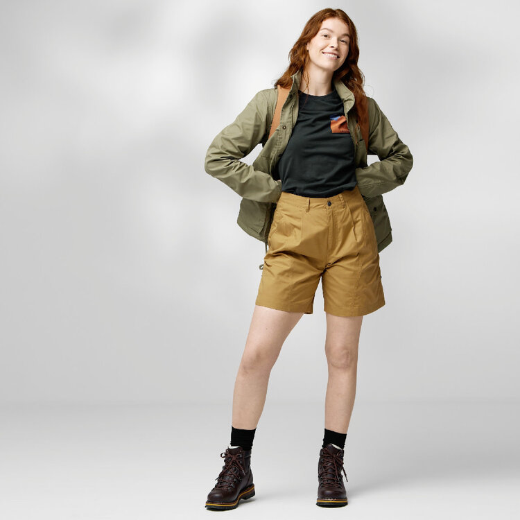 Comfortable, durable shorts in G-1000 Stretch made from recycled polyester and organic cotton – Vardag Shorts W offer practical shorts for everyday use. They have a high waistline and flattering silhouette with wide leg openings for a more comfortable fit. The length of the legs can be adjusted by rolling the hems up and holding them in place with buttoned straps at the sides. The shorts have pleats at the front, open hand pockets and two open back pockets.